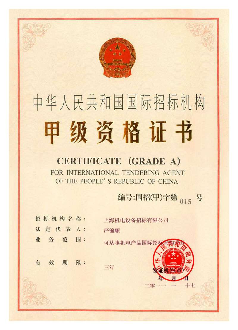 國家對外貿易經(jīng)濟合作部授予的首批《國際招標機構甲級資格證書(shū)》。
